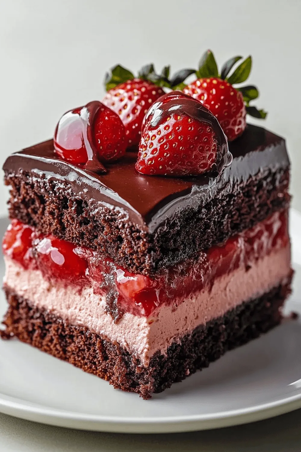 The layers of fluffy chocolate sponge are complemented by a luscious strawberry filling that brings freshness and vibrancy to each bite. Not only is this cake visually stunning with its vibrant colors and textures, but it also has an incredible taste that keeps people coming back for more. Best of all, you can easily make it at home with simple ingredients found in your kitchen.