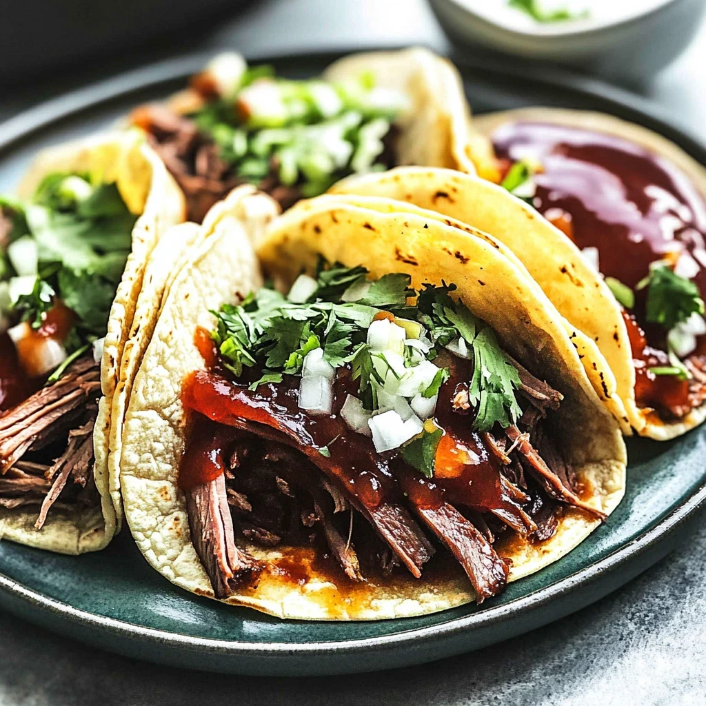 Assemble Your Tacos: Now comes the fun part! Grab each warmed tortilla and generously fill it with your perfectly shredded brisket; let those juices flow! Top it off with a handful of fresh cilantro for a burst of color and freshness, followed by finely diced red onion for crunch. Don’t forget a dollop of creamy sour cream and your favorite salsa—these toppings bring everything together into one delightful bite. Serve these vibrant brisket tacos immediately while they’re warm, gather around with family or friends, and enjoy every delicious moment!