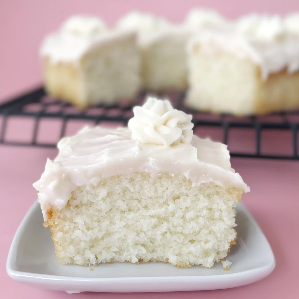Assemble the Cake: Once your cake has cooled completely (this is vital!), it’s time for the fun part—frosting! Use an offset spatula or knife to spread that fluffy frosting evenly over the top and sides of your cake. Don’t worry if it doesn’t look perfect; each swipe adds character! Once frosted, slice yourself a generous piece of this delightful snack cake. Serve it up as a treat during tea time or share with friends at gatherings; either way, this White Snack Cake is sure to bring smiles all around! Enjoy every bite as you relish in your achievement!