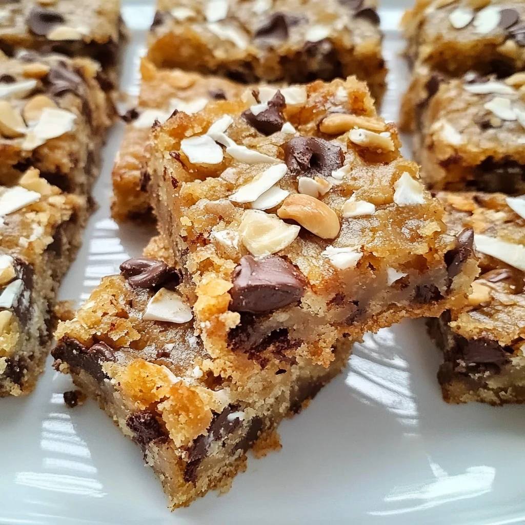 Deliciously layered bars with a combination of chocolate, coconut, and nuts, perfect for a sweet treat.