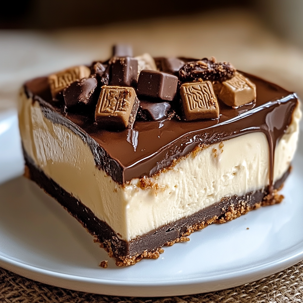Garnish Before Serving: Once set, drizzle chocolate sauce over top and sprinkle reserved chopped Twix pieces for an elegant finish. Slice into wedges before serving to showcase those delicious layers!