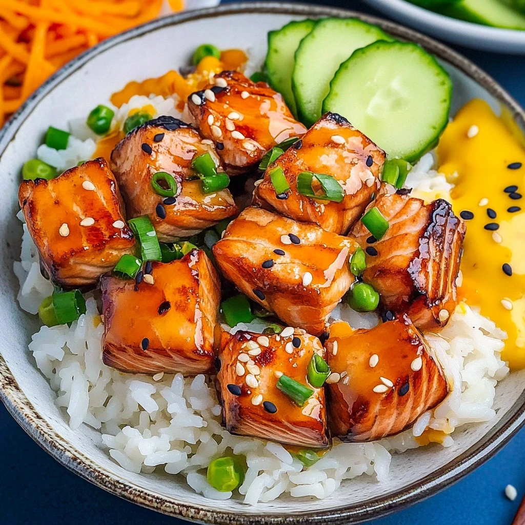 Assemble Your Bowls: Fluff your cooked rice and divide it into bowls. Top each bowl generously with cooked salmon, fresh veggies, green onions, and sprinkle sesame seeds.