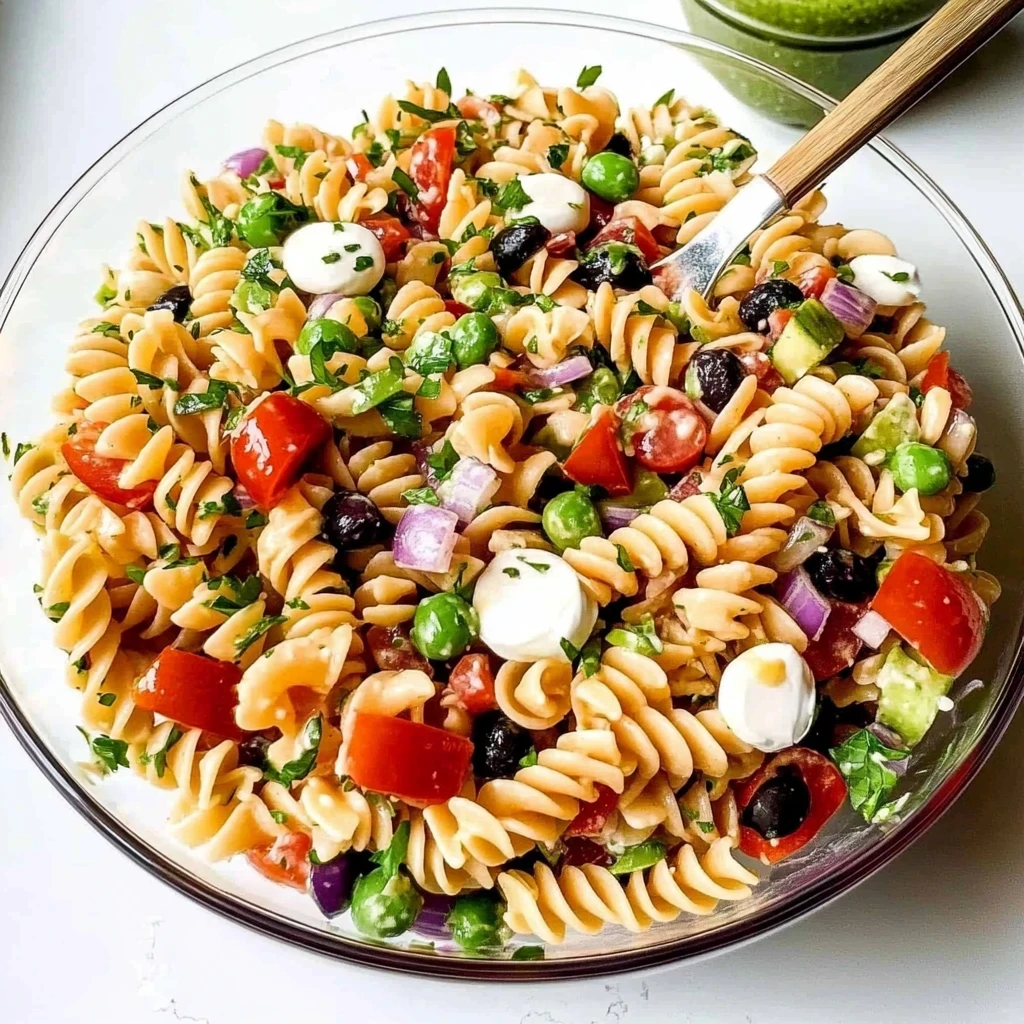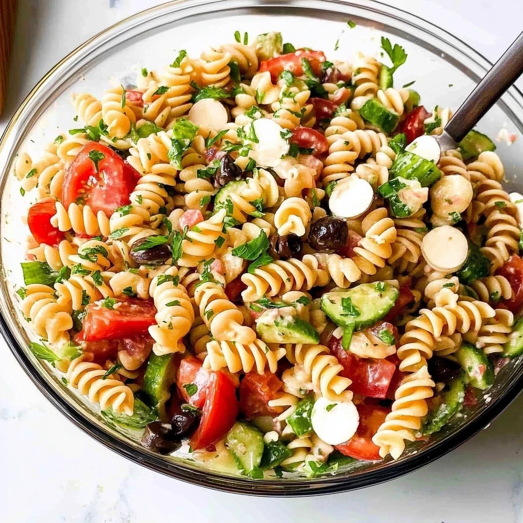 Garnish and Serve: Finally, sprinkle chopped fresh parsley and basil on top for that aromatic finishing touch. These herbs not only add a burst of green but also lend an incredible fragrance that elevates your dish. You can serve this delightful pasta salad immediately or let it chill in the refrigerator for about 30 minutes to allow all those wonderful flavors to meld together—trust me; it’s worth the wait! Enjoy this refreshing dish with friends and family; it’s perfect for any gathering or simply as a delightful meal at home!